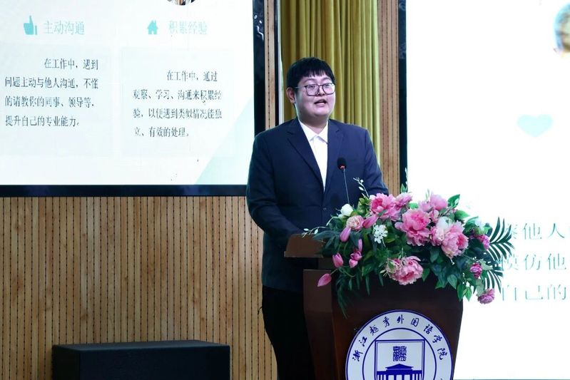 掌声渐息,接下来是2022级酒管学生代表王毅分享实习心得。从如何选择实习酒店到实习期建议,王毅同学用亲身经历和诙谐的语言解开了大家心中对实习未知的困扰。