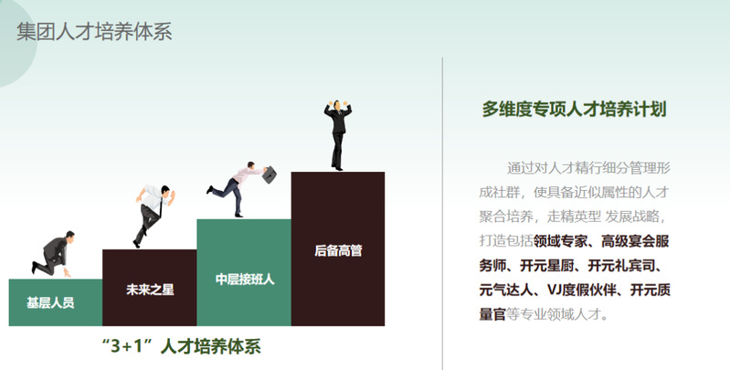 俞总详细解释了万豪集团“3+1”人才培养体系:基层人员→未来之星→中层接班人→后备高管。通过对人才精行细分管理形成社群,使具备近似属性的人才聚合培养,走精英型发展战略,打造包括领域专家、高级宴会服务师、开元星厨、开元礼宾司、元气达人、VJ度假伙伴、开元质量官等专业领域人才,实现多维度专项人才培养计划。