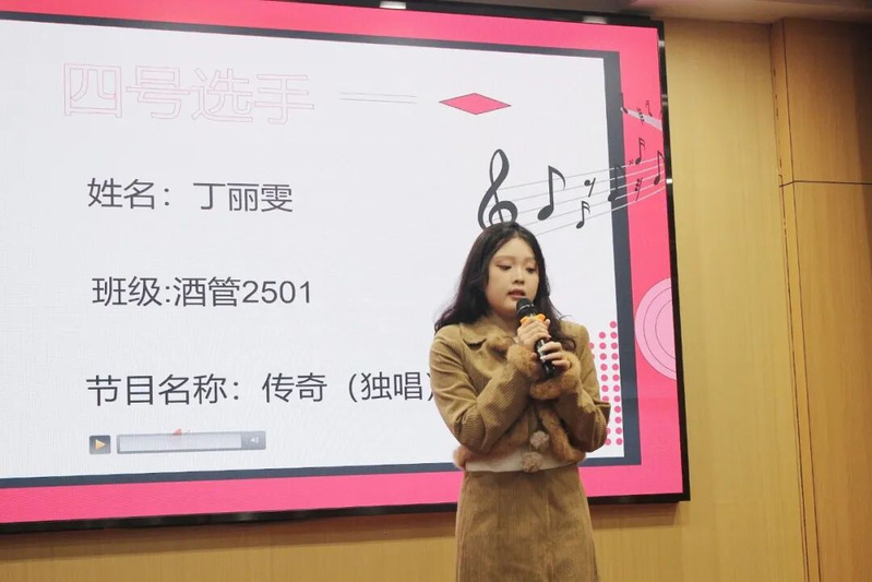 诗意氛围升腾!由酒店管理2501班丁丽雯同学演唱《传奇》,歌手以温柔婉转的嗓音,缓缓诉说一段跨越时光的深情与眷恋,曲调悠扬婉转,众人沉醉在此空灵旋律中。