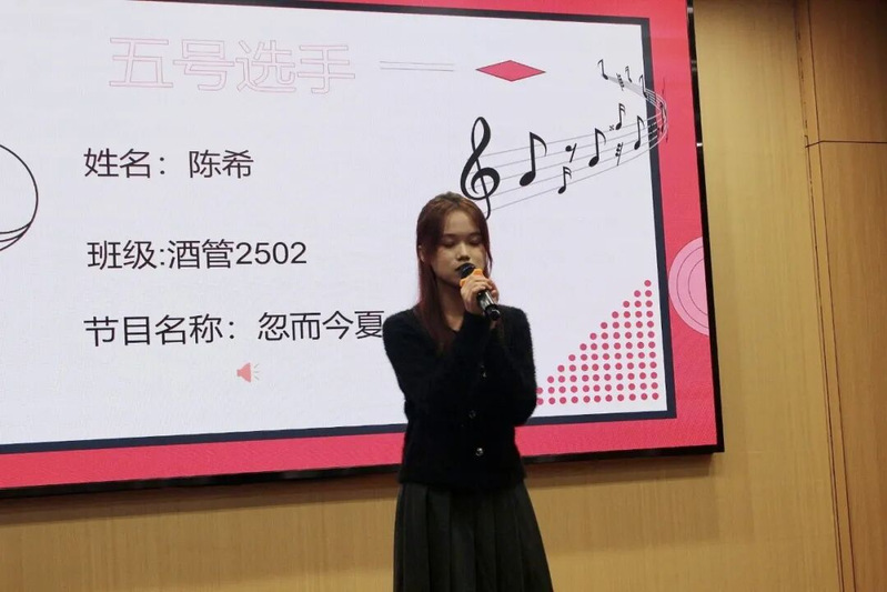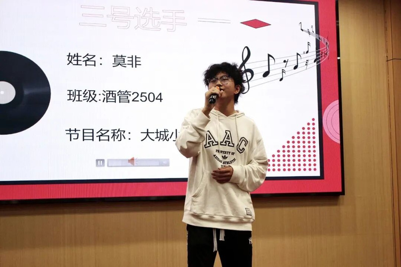 紧接着由酒店管理2504班的莫非同学为我们带来歌曲《大城小爱》,以其轻快悦耳的节奏和动人走心的歌词,瞬间抓住了所有人的耳朵。