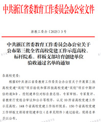 近日,中共浙江省委教育工作委员会公布第三批全省高校党建工作示范高校、标杆院系、样板支部培育创建单位验收结果。在学校党委的精心培育和全程指导下,酒店管理学院党委凭...